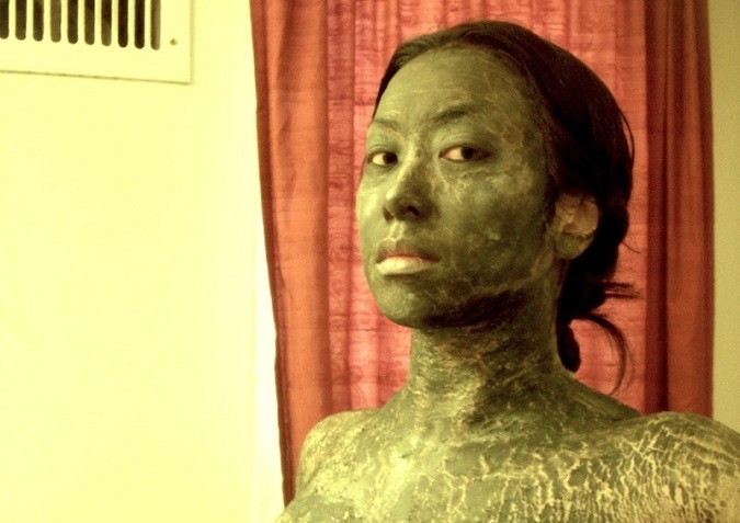 The makeup oddly photographs brown. I’m looking in the mirror, and I’m green. Then, I look at my camera’s viewfinder, and I’m brown. Huh. I’m sure professional makeup artists are aware of this kind of discrepancy. I’m frustrated at the moment—but I just need to find the right lighting in the house.