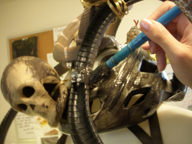 Painted helmet with black, washable poster paint. Great thing about Golgari is that its style identity is rough around the edges, so no need for extreme neatness. No finished edges required, and I can paint outside the lines! The more organic it looks, the better.