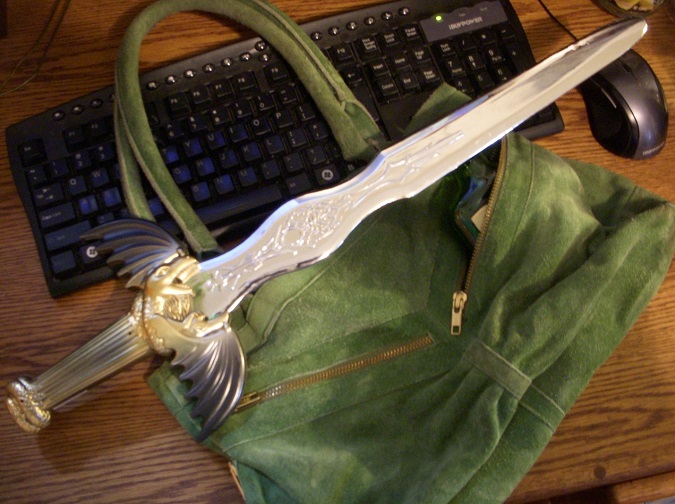 Couldn’t resist doing more. I think I avoided another Jo-Ann trip by using some acrylic paint as highlights instead of acquiring new stuff—gold and mixed some Kelly green. I added a Golgari guild symbol to the back of the shrug in Sharpie. I also found some items in the basement that would be great for a Vraska night on the town . . . you know, like when she goes on OkCupid dates in Tin Street Alley.