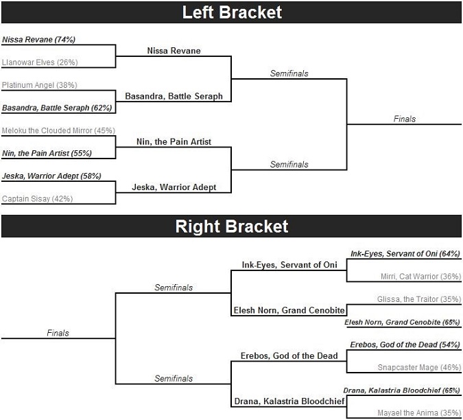 In the left bracket, Nissa Revane and her Zendikarian minions prevailed over those steampunks from Llanowar. Basandra’s two-piecer reigned supreme in the skies over Platinum Angel’s cool inaccessibility. Nin strong-armed Meloku into submission, and Jeska emerged victorious in a close call with Captain Sisay. On the right, we had the rat over the cat in a decisive win for Ink-Eyes versus Mirri. Elesh Norn compleatly routed Glissa, the Traitor; and Erebos’s whip proved more appealing for fans than the arm cannon of Snapcaster Mage. Finally, Drana, Kalastria Bloodchief sunk her teeth in deep against Mayael and drained the Anima of resistance.