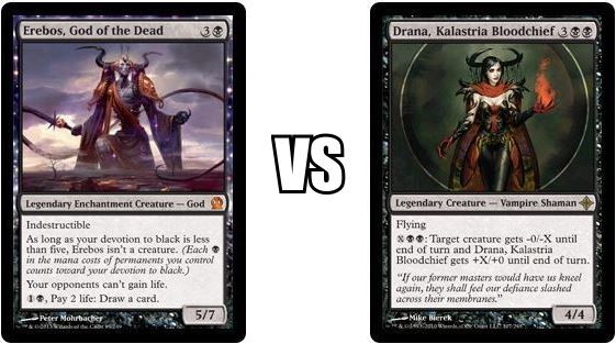 Ah, the matchup of darkness. Our black-horned beautifies fight it out in the Abyss—is the suavely elegant Erebos or the dangerously composed Drana our victor? Erebos demands your devotion, Drana demands your life force. Do we choose the God of the Dead’s more subtle strategy or the Bloodchief’s brutal bite?
