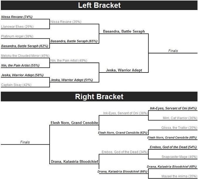Basandra, Battle Seraph and her cat-o’-nine-tails decisively scourged Planeswalker Nissa Revane from the arena. In what quickly developed into a polarized nail-biter, Jeska eked out victory over Nin by a mere twentyish votes, helped along by rk post’s promises of Jeska swag should she win the challenge. In the right bracket, the Grand Cenobite completed this round of her domination by putting a big alabaster butt in front of Ink-Eyes, Servant of Oni’s hopes of victory. And, in our black supremacy battle between horn-y contestants, Drana came out on top of Erebos.