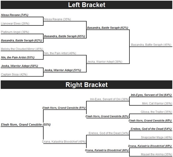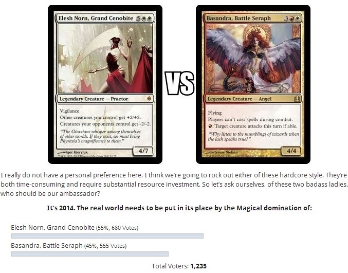 In what can only be called an epic victory, Grand Cenobite Elesh Norn of the Machine Orthodoxy has united all beneath her equally epic headdress. The elegant and haute couture Praetor of Unity defeated the firm and fiery Basandra, Battle Seraph in the final round of Ultimate Cosplay voting, carried to the win atop the flensed shoulders of her compleated loyal legions.