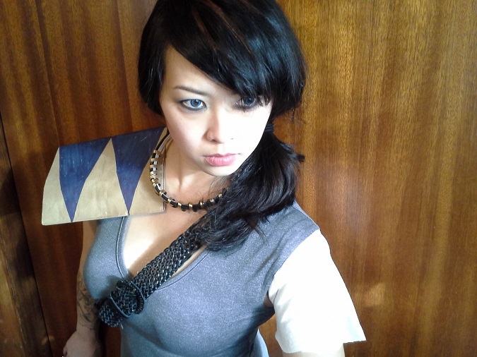 I cut the white sleeve off a t-shirt, stapled it to the tank top, put a belt around my torso, subbed in Cymede’s hair band for a chunky necklace, and teased my hair into a side pony. To make the pauldron thing, I folded up a small paper bag, stenciled on the distinguishing diamond pattern, and colored it in with a blue Sharpie. I stapled the pauldron to the vest. I colored chunks of my bangs with a red makeup crayon (lipstick would work, too), but it didn’t show up as well as I’d hoped—I should have done thicker swaths of color. And I put on a lot of black eyeliner. More pics here.