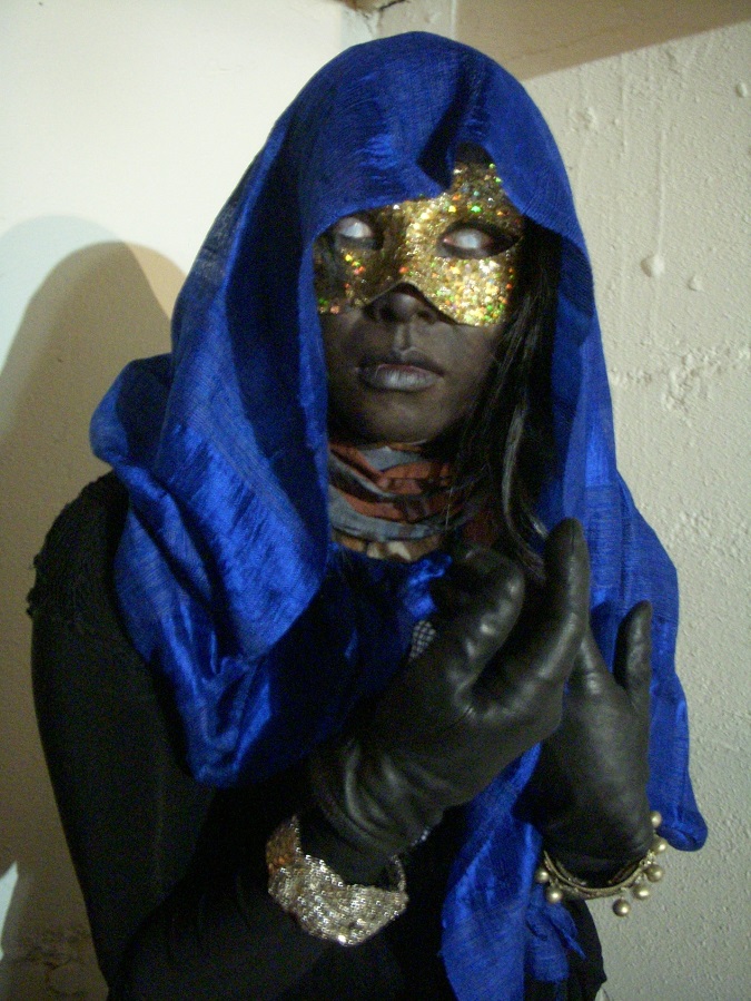 I traced the pattern of the mask onto my face so I could color outside the lines (didn’t want to color any more surface area than I absolutely had to). Obviously, if you had a full-face mask, you’d barely have to color anything but your neck—but the neck is important! Any skin showing around the face has to be dark or it’ll ruin the effect. I did two layers with the crayon and then took a blush brush and powdered black eye shadow all over to add more opacity and pigment. Other than that, all you need is to put on head-to-toe, fitted, black clothes, and layer some Theran brights over it. Finish with some flashy costume jewelry. I made sure to style my hair forward and cover my head with a scarf because I did not want to deal with coloring my ears. More pics here.