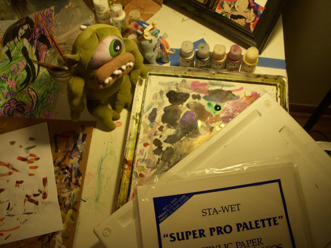 Basics: Masterson Sta-Wet Palette and Golden fluid acrylics. The palette comes with a foam insert and special paper that you dampen to help keep your paints wet for multiple projects.