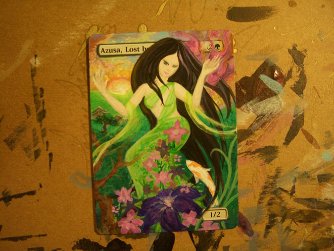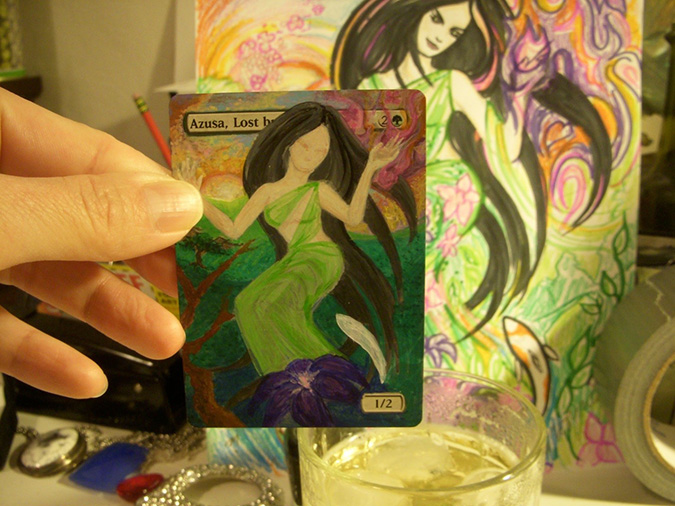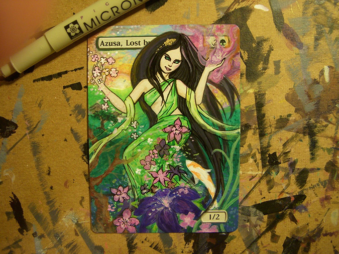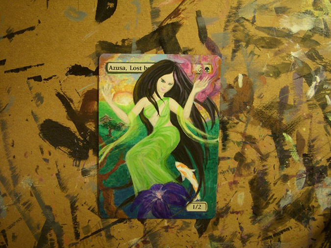 Hurray! A unique take on Azusa, from scratch. Right up my alley. Plus, Azusa is such a badass lady in both Modern and Commander. I’d done an Azusa extension before and really enjoyed it—jumping in and swimming naked in the warm waters of her effulgent green fire and all that—but I’d never done an Azusa full art. My next move was to e-mail Joshua with a few questions that would help me develop his concept.