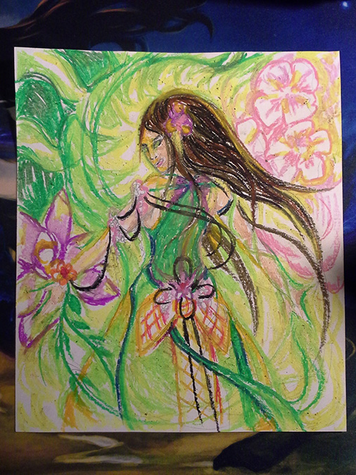 Now it’s time to add imperfect detail. I worked on her hands and fingers, shading her dress, colorizing the fish and the flower, and highlighting her hair. I sketched in her facial features.