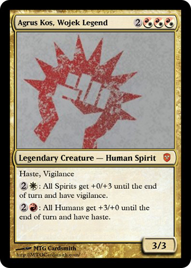 After reading the Agrus Kos lore, I noticed that he has the ability to possess other beings. I used this piece of lore to inspire his possession ability. The possessed creature has battle cry and first strike because I thought they were the most applicable abilities for a Wojek leader to give.
