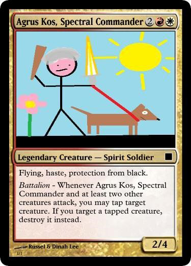 Bennie: It’s a very efficient beatdown commander, though the activated ability feels a little too “small” for a legendary creature—why not open it up a little bit by letting you give target creature vigilance until end of turn? It would still work on Agrus Kos, but in the late game, you can use it as a mana sink for other creatures, including those of opponents for political favors.
