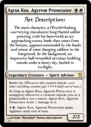 It’s been a long and exciting road, my friends. Today, I am psyched to present the winners of the first Retribution in Ravnica design-a-card-contest, in which we successfully gave Agrus Kos a new look and totally retooled card that still stays true to his personality and colorful history.
