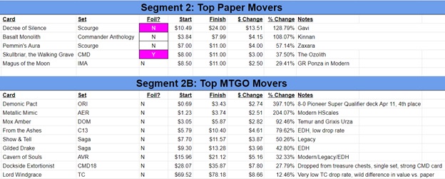 Over on MTGO the guys note the upward momentum of Demonic Pact, Metallic Mimic, Mox Amber, From the Ashes, Show & Tell, Gilded Drake and more.