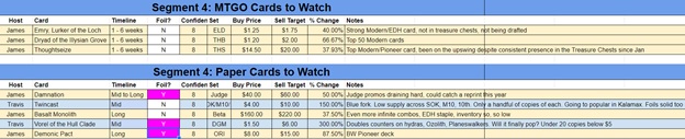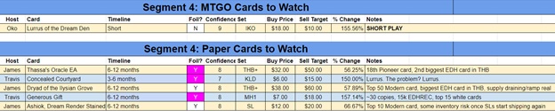 James & Travis shift gears to talk over cards that may see an uptick within the next few months in both paper and online, including shorting Lurrus, and considering purchases of premium versions of Thassa's Oracle, Dryad of the Illysian Grove, and Ashiok, Dream Render.