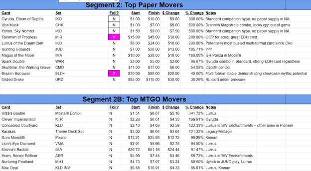 Your hosts recount the price motion on paper cards again this week including Gyruda, Doom of Depths, Uba Mask, Yorion, Sky Nomad, Talsiman of Progress, Lurrus of the Dream-Den, Magus of the Moon, and Skullbriar, the Walking Grave.