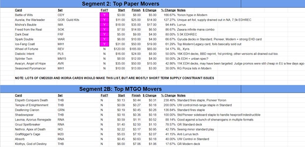Your hosts recount the price motion on paper cards including Battle of Wits, Aurelia, the Warleader, Mishra's Bauble, Freed From the Real, Dark Deal, Ice-Fang Coatl, and more.