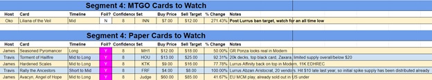 James & Travis shift gears to talk over cards that may see an uptick within the next few months in both paper and online, including LOTV on MTGO, Seasoned Pyromancer, Torment of Hailfire, Hardened Scales, Rally the Ancestors, and Avacyn, Angel of Hope Judge Promos.