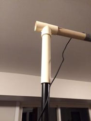 For approximately $4 in additional parts, I constructed the attachment in Figure 2. It’s a one-inch PVC T-junction affixed to the light pole with an eight-inch section of PVC piping. Coming out the horizontal is a one-inch dowel that the camera can be secured to, suspended over the play area, as in Figure 3.