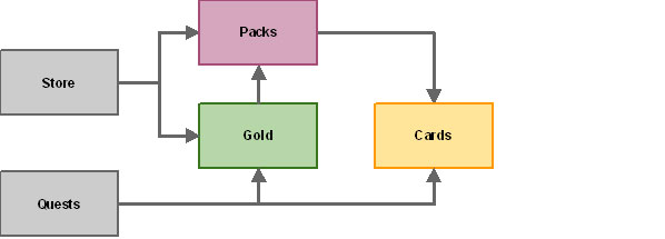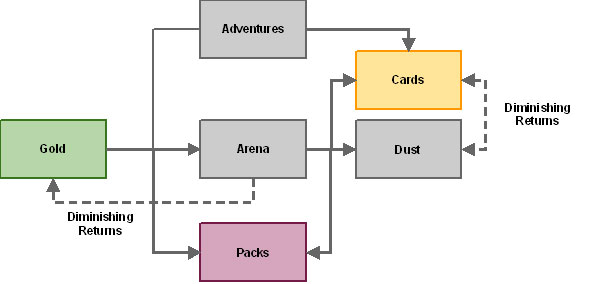 As Hearthstone does not allow players to trade cards or packs between each other, the economy is one-way—from the player to Blizzard. This is the diametric opposite to Magic Online, in which players, Wizards, and bot owners (effectively online stores) share a communal economy of packs, cards, and tickets. This makes the Magic Online economy dramatically more complicated than hearthstone, and the economic drivers, levers, and equilibrium a lot more unstable. Additionally, Hearthstone arena awards prizes in a seemingly random mix of packs, dust, gold, and single cards, whereas Magic Online rewards are predictable in terms of expected value (EV).
