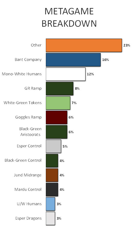What was the top Standard deck of the Pro Tour? Based on the decks with six or more wins in Standard, it was Bant Company, not a huge surprise. Mono-White Humans was next with 12%. Here is the full breakdown.