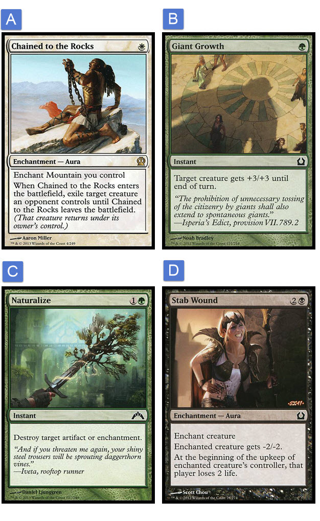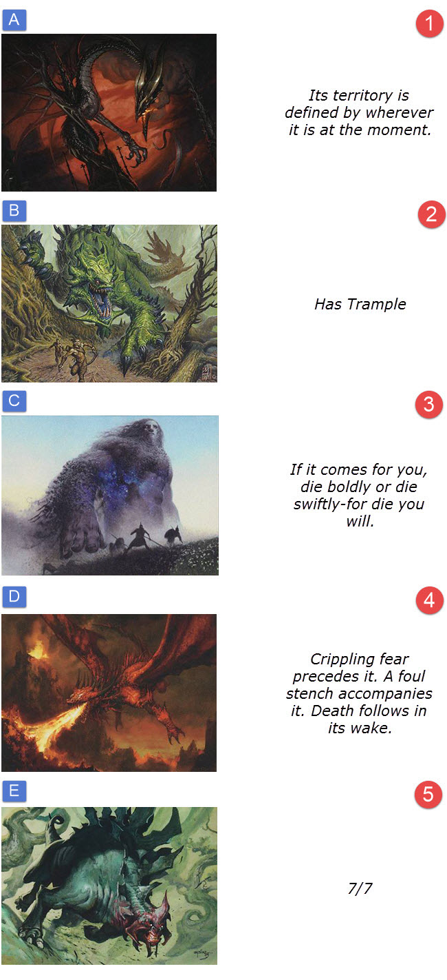 Match the artwork below (labeled A to E) to the flavor text or other characteristic of its card.