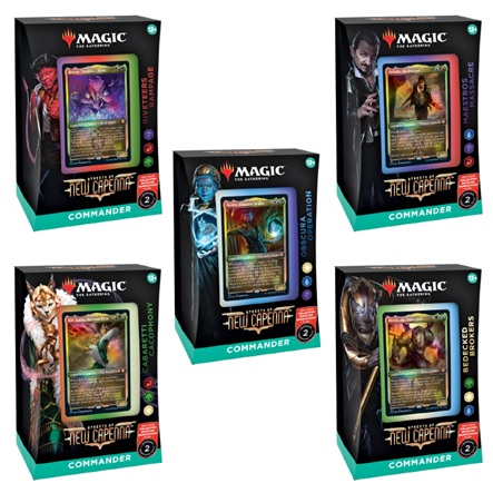 With Streets of New Capenna comes several new Commander precons. This isn't just the normal two or three that come with a set release nowadays, but rather it's a full set of five! This is basically what usually became known as the annual Commander release - effectively Commander 2022 - and as such we get five whole decks representing each of the five families of the gangster world. We have Bedecked Brokers, Obscura Operation, Maestros Massacre, Cabaretti Cacophony, and Riveteer Rampage making up the five decks.
