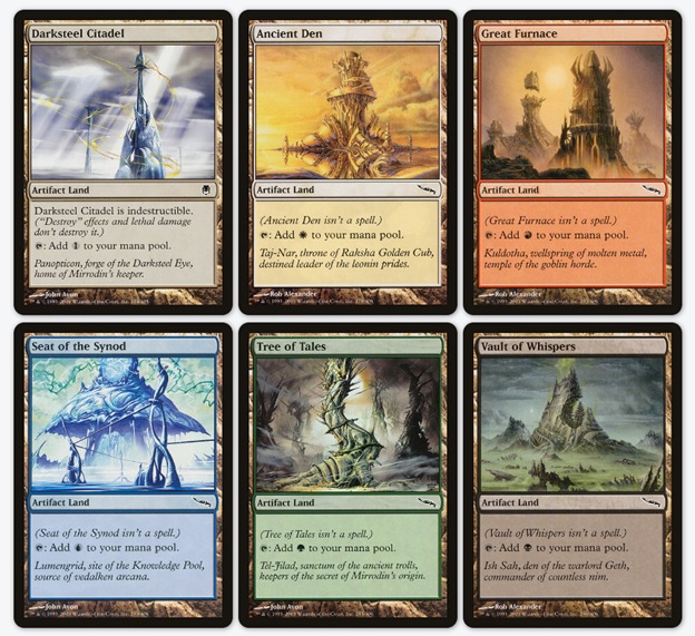 The original five artifact lands were released in Mirrodin with one fore each color, as well as an additional colorless one showing up in the following set Darksteel featuring indestructibility. These lands completely broke the Standard environment they were in when paired with the "affinity for artifacts" mechanic used on cards like Frogmite, Myr Enforcer, and Thoughtcast. Because of these tremendous synergies, all six artifact lands were banned alongside the cards Arcbound Ravager and Disciple of the Vault (as well as Skullclamp for its own reasons).
