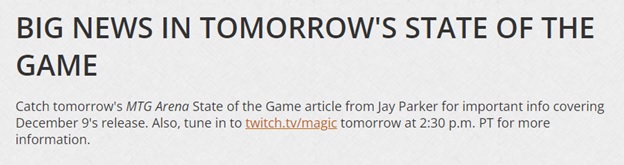 As the note implies, there was something big cooking up, but no one knew what it was yet. My mind jumped to some of the obvious things. The most notable part was that it was something incoming for the version update that was dropping in a little over a week, meaning that it was something that could be announced and implemented right away. This told me it probably couldn't be a new Historic Anthology or Historic Horizons-style release because of the lead-up time those releases had. My mind jumped to one of three things: increased Pioneer support, spectator mode, or multiplayer support.