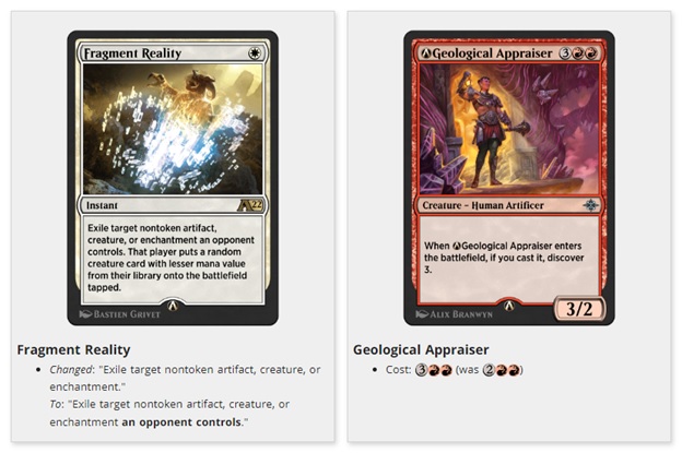 In addition to the printing of several new digital-only cards, two well-known cards also received changes. Players will quickly recognize Geological Appraiser, which was banned in December from Pioneer as well as Explorer. This change puts it at a higher cost, intended to slow down its utility in games. Players who don't use MTG Arena's digital-only formats may not recognize the other one in Fragmented Reality. Players would utilize this card to target a Leyline that would come into play at the start of the game to cheat out a nasty threat like Geist of Saint Traft into play on turn one.