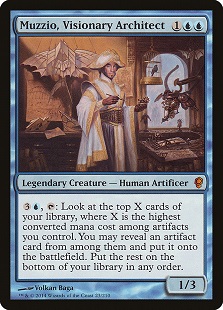With the Commander format on the rise, people were starting to pick up on which commanders were better than others. One that came up often was the powerful Arcum Dagsson from Coldsnap, as it enabled you to cheat out powerful game breaking artifacts cheaply. When players saw Muzzio, there was a fear that he might enable the same sort of shenanigans and might end up being a problem himself. As it turns out, Muzzio plays pretty underwhelmingly, and while he is neat, he's still very much on the lower end of this list because, well, there's just better options and was long before his printing.