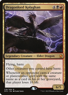 Kolaghan is a bit of a weirdo. The card reads wildly powerful, but the two formats that ultimately want the card most - Commander and Cube- can't reliably take advantage of the ability that deals 10 damage to your opponents. Still, even ignoring that line of text, the fact remains that Dragonlord Kolaghan is still a hasty house, and the fact that it gives all your other stuff haste still gives it relevance in non-60 card Constructed formats.