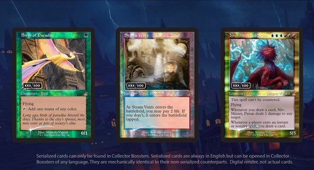 At the end of the Banned and Restricted discussion held on Weekly MTG, Blake noted that next week would be the first look at Murders of Karlov Manor. In addition, the week after would play host to a two day reveal of Ravnica Remastered. As a little teaser to the Ravnica Remastered reveal, the official Magic: The Gathering Twitter page shared a spicy preview: serialized retro frame cards! Only three cards were shown: Birds of Paradise, Steam Vents, and Niv-Mizzet, Parun, though it can be inferred that we will see all 10 shock lands presented in this manner. Each one will have 500 numbered copies out there for the most diehard players to collect.