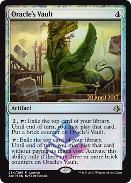 First and foremost, Oracle's Vault is colorless, so it can go in any deck your heart desires. It immediately reminds me of a certain six mana artifact that ends up in way less decks than it should, Staff of Nin. For two less mana, you get an artifact that can’t pick off small creatures or peck opponents to death, and it is much worse at giving you real card advantage since the cards it provides you only stick around until the end of the turn. However, that second ability makes a world of difference. Once you have three brick counters on your Vault, by whatever means you put brick counters on your Vault, that’s when the real fun starts. Once you’ve finished constructing the Oracle's Vault, you get to start casting cards off of the top of your library for free, and that is some incredible value. Being able to cast an extra spell for free every turn is certainly powerful, as are most things that let you cheat costs. Even if you flip a land, you still have the option to lay it on the table since Oracle's Vault specifies you can play the card, not cast it.