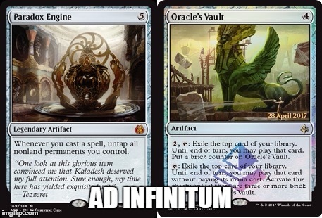 - You can even go crazy if you involve Paradox Engine (though, that card is already crazy by itself). Tap the Vault, cast the spell, untap the Vault, tap the Vault, cast the spell, untap the Vault . . . it could go on forever, especially if you have a Sensei's Divining top in play and a mana rock to activate it between Vault triggers. The thought makes me sick to my stomach because of how much you can abuse Oracle's Vault with Paradox Engine. *Shudder*