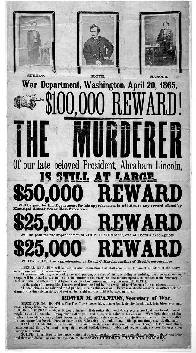 One of the most famous posters, issued by the US Government, was released after the murder of president Abraham Lincoln by John Wilks Booth. The wanted poster details the murder and rewards for turning in Booth and his two accomplices.