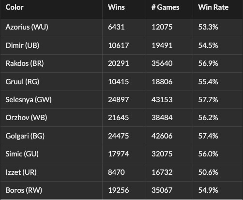 As you can see, Golgari and Selesnya are the clear winners, boasting a 57.4 and 57.7 win percentage, respectively. There's a dropoff with the Blue decks by a couple percentage points, the largest delta being 7.1% between Izzet and Selesnya! Izzet, Dimir, and Azorius are the lowest-winning archetypes, with Simic a bit higher due to its pairing with Green, which is arguably the best color in the set based on this data.