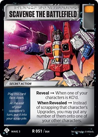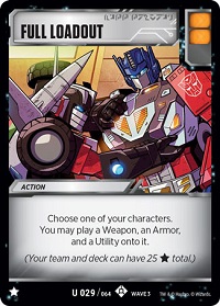 Because our equipment targets our opponent's upgrades when scrapped as well as when equipped, we are empowered to swap our equipment often. To accomplish this, we're going to rely on a few less obvious tools such as Scavenge the Battlefield, Bolster, and since our character cards only add up to 24 stars out of our available 25, a copy of Full Loadout. The standard Transformers TCG deck is a minimum of 40 cards, and for efficiency that's what most decks run, but I think we can make an allowance for 41 cards in this case.