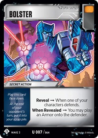 Leading the team is Sergeant Sparkstalker, and while his stats aren't overly beefy, he does boast a 4 attack and 2 defense in both modes so we don't have to worry about trading off when flipping for his abilities. And what abilities they are! Once you've got Sparkstalker in bot mode, he's going to be a somewhat consistent draw engine for our deck, since we're going to be leaning heavily on orange pips and having plenty of Bold on our Firecons. Flipping him back to alt mode also continues our disruption tactics by allowing us to scrap an armor off an enemy. The timing of these flips is going to be crucial to making sure our biggest hits get through.