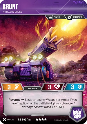 Well, the answer to this lies with the new Wave 4 mechanic of Revenge. A character's Revenge ability triggers when that character is KO'd by any means, even at the hands of their own allies. Each of Trypticon's minions; Brunt, Full-Tilt, and Wipe Out; have their own Revenge ability.