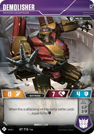 However, while we can pull off our trick with Megatron, he's not going to be the focus to start with. That honor is going to another tank, this time all the way from Wave 1. Demolisher, Devoted Decepticon actually has two very good abilities we're going utilize here. When flipping to alt-mode, he is a decent card draw engine, especially since we're going to be running 3 tanks on our team. What really excites us, however, is his bot-mode ability. Since the wording on his card simply states to flip extra battle cards equal to his defense value but does not specifically say that this is the same as Tough, it lets us get around pesky things like Stunticon Swagger and Acid Storm's abilities to shut down Tough. It also means that we're going to be able to flip a large number of cards when he attacks, almost single-handedly assuring us of the 5 distinct pips we need in order to activate Overwhelming Advantage.