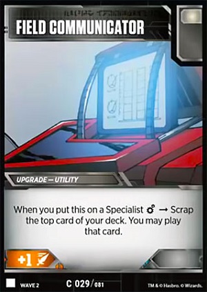 While not quite as impressive, or as sure of a play as Multi-Mission Gear, Field Communicator can be just as impressive in the right hands. With the amount of Plan and Focus effects that exist in the game, as well as cards like Incoming Transmission that allow us to stack the top of our deck, we can be reasonably assured that we hit an action. Even if the card that we scrap isn't an action, with Anticipation Engine and Multi-Mission Gear in our decks, it's very nearly the same thing.