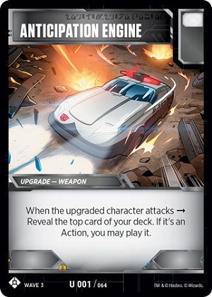 While Anticipation Engine does not allow you to play an extra action during the main phase of your turn, it does allow you to play actions from the top of your deck when the character attacks. In combination with characters or other upgrades that allow you to Plan during your turn, Anticipation Engine allows for stacking your deck with an action from your hand while also playing an action from your hand. Since it is an upgrade, it sticks around to be used multiple turns in a row. Under the right circumstances, and with the right build, Anticipation Engine can provide a continuous advantage and help you keep the pressure on your opponents by simply out-actioning them turn for turn.