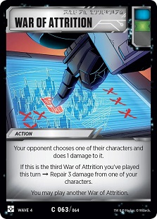Not to be left out and forgotten are the trio of actions that allow you to play more copies of that action per turn. Focus Fire, Sonic Scramble, and my new favorite, War of Attrition, all allow for extra action plays and come with some fairly nice bonuses if you manage to play all three copies in a single turn. They also all come with a green battle icon, allowing us to pull these to our hand during combat to save up for that turn where we unleash the full fury of the accumulated actions.