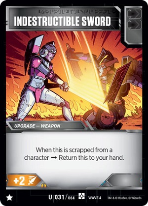 Along the same lines as Crowbar, Indestructible Sword is a static +2 attack upgrade with two black pips for that extra pierce on the flips, and as an added bonus, doesn't scrap itself after combat. Instead, if this card would be scrapped, you just pull it back into your hand to simply play again on another one of your bots, keeping the cycle of pain turning in your favor. All great things come with a price, however, and much like Crowbar's price is scrapping it after combat, Indestructible Sword's price is that it costs a star to run in your deck. In a limited pool, finding a perfect 25-star combination of characters is fairly difficult in its own right, so being able to carve out a spot for this impressive upgrade shouldn't be too difficult.