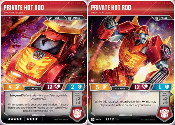 The first Hot Rod released in this card game was part of a combiner team, and as part of that team, he was fairly solid, but not overly stand-out as far as characters go. Wave 4 Hot Rod, on the other hand, may just be one of the better characters in the new set. Early game, Hot Rod's alt-mode Safeguard ability helps to keep him from taking any massive hits, and with the smaller deck size of drafts, it should be nearly trivial to get that extra card underneath him. Mid to late game, with that card beneath him, his bot-mode ability allows you to play an extra action per turn. In a format that lacks other reliable ways to get extra action plays, and with the sheer number of powerful actions in the set, this ability goes above and beyond, giving your draft pool an extremely powerful edge.