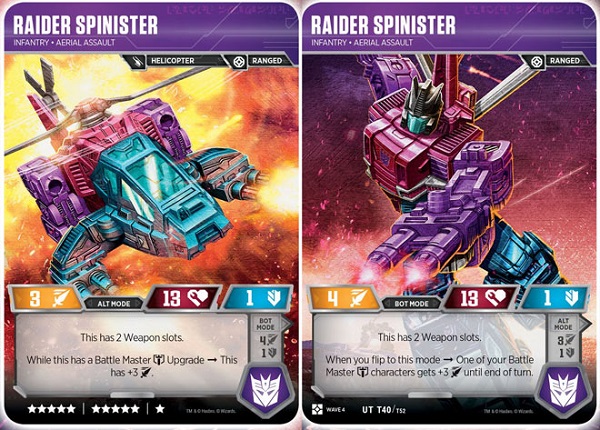Coming in as my top-pick for the Decepticon faction is Spinister. The most immediate reason to run Spinister is the simple fact that he has two weapon slots, something very few other characters can boast. There's a high number of quality weapons in the most recent set, any number of which can be a major asset on any character, and being able to drop two on the same character can elevate them to being a major powerhouse on your team. On top of being a strong lone warrior, Spinister is also, shockingly, a team player, especially with the continued usage of Battle Masters in Wave 4. With the ability to pump their attack, and in turn be boosted by them even further when one ends up equipped to him, picking him early and substituting your team with a low-cost Battle Master is a solid plan.