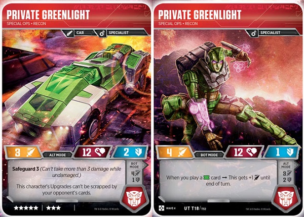 Once again we come with an Autobot pick that starts with Safeguard and a powerful secondary ability in alt-mode. Greenlight, like Hot Rod, is tough to kill off in the early game, and on top of that, your upgrades also get extra staying power. In a Limited format, upgrade removal is always a strong effect to bring to bear, but Greenlight simply ignores all of that while in alt mode. In bot mode, Greenlight lives up to the color of her namesake, getting a bonus to attack each time you play a card with a green battle icon. Given that green battle icons, by design, bring themselves easily to hand when flipped during combat, being able to activate this bot's ability easily is far from out of the question. On top of that, she's an eight-star character with impressive enough stats at only an uncommon rarity.