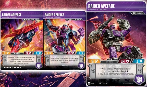 The only triple-changer on my pick list, Apeface is a true force to be reckoned with. At the start of the game, his Focus ability allows for the stacking of your deck to make his attacks as effective as possible. Once he's taken a hit, his second alt-mode ability grants Bold 3, allowing him to swing in for some truly devastating hits in a Limited format. Once he's taken another hit or two, transforming him to his bot-mode makes him even harder to kill with Tough 3. The key to really getting the most out of Apeface in a Limited format is to draft an evenly balanced deck, with a good mixture of both offense and defense. Either way, for only 10 stars and packing a whopping 5 attack base, Apeface is a solid draft pick all around.