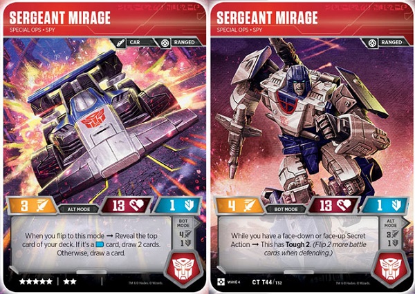 Yet another hard to kill Autobot, Mirage may not have Safeguard on his alt-mode, but he is a solid card draw engine. Card advantage is always excellent to have in any Limited format, and Mirage guarantees at least one card when flipped from bot to alt modes, and a good chance for two depending on how you've drafted your battle cards. In bot mode, he sports an impressive enough Tough 2 when you have a secret action in play, which if you pay attention to your deck-building, shouldn't be too much of a challenge. Given the quality secret actions in Wave 4, drafting them should already be near the top of your list anyway.