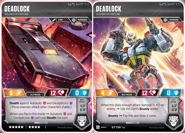 Summing up my top eight is neither an Autobot or a Decepticon, but one of the new Mercenaries, Deadlock. What makes this Soldier of Fortune so fantastic is he simply can't be attacked by either Autobots or Decepticons so long as he's in alt-mode and there are other legal targets. Not only does this give him excellent survivability, it allows you to keep him healthy enough to set up for him to get the kill while in bot mode, allowing you to strike, KO a character, draw your two cards, and then run away back to alt mode to hide from your opponents once again. Things get trickier in the end game when you're down to just a couple of characters, or Deadlock by himself, but hopefully he's already done enough damage to have paid for his nine stars.