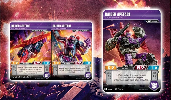 Moving onto the Decepticon ranks, Raider Apeface swings into action with a quite bizarre set of abilities, which are quite different from what we've seen thus far in the game. With each of his modes being dedicated to working at a specific point in the game, this isn't a character that you're going to be flipping on just any old turn, you have to make sure to pace him exactly right to get the most benefit from what he can provide. He'd likely play very well into a well-balanced deck that can easily shift between offense and defense.
